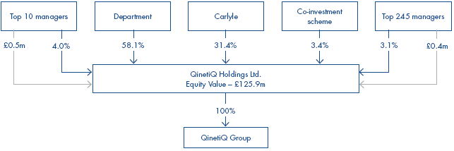 2.33 In February 2003 QinetiQ Holdings Ltd was formed as the acquisition vehicle to complete the transaction. It was established with an equity value of £125 million.27 QinetiQ Holdings Ltd acquired 100 per cent of the shares in QinetiQ Group from the Department for £117 million. The £117 million was made up of £78.2 million of shares in QinetiQ Holdings Ltd (62.5 per cent of the equity) and £39 million in cash. Although the Department had agreed to sell 37.5 per cent of QinetiQ, 3.7 per cent was to be set aside for QinetiQ staff under the co-investment scheme. Carlyle paid QinetiQ Holdings Ltd £42.2 million to acquire 33.8 per cent and QinetiQ employees paid a further £4.6 million for 3.7 per cent. The top 10 and top 245 managers subscribed for new shares in QinetiQ Holdings Ltd worth £0.5 million and £0.4 million respectively; these shares diluted the shareholdings of the Department, Carlyle and the co-investment scheme proportionally. The structure of QinetiQ Holdings Ltd at the completion of the deal is set out in Figure 10.