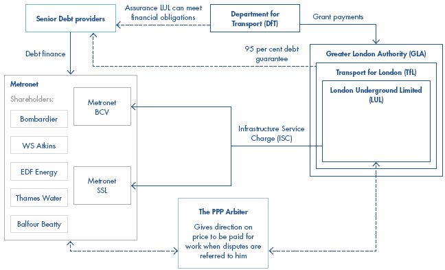 5 DfT, the Treasury and London Regional Transport (which owned London Underground until July 2003 when it was transferred to Transport for London (TfL)) had responsibility for the strategy and design of the PPP arrangements. London Underground negotiated and managed the contracts. DfT retained a crucial role after the PPP contracts were put in place. It gave assurances to Metronet's lenders that it would not stand by and do nothing should London Underground be unable to meet its financial obligations and provided an annual grant of around £1 billion for the modernisation.