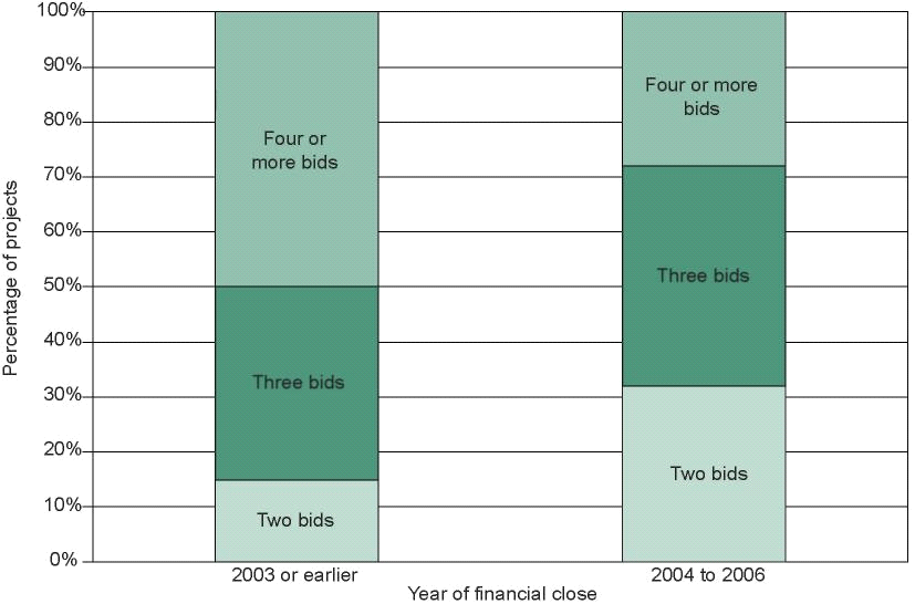 1. If value for money is to be achieved and maintained, it is critical to have a functioning competitive market, yet the proportion of projects attracting only two viable bids has increased in recent years. Whereas 15% of projects that reached financial close in 2003 or earlier had attracted only two bids, this figure had more than doubled to 33% for those projects that closed between 2004 and 2006 (Figure 1).4
