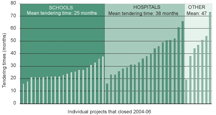 8. The average tendering time from initial advertisement to the close of a deal for PFI projects in 2004-2006 was 34 months, compared to 33 months for projects that closed prior to 2004, although there were significant differences even within sectors (Figure 2). The shortest overall tendering period was 16 months, whilst the longest was 73 months. The average cost of external advice for each project was £3 million, reflecting the length of the process, and delays to the schemes (as well as putting bidders off) cost the taxpayer at least £67 million in total.11