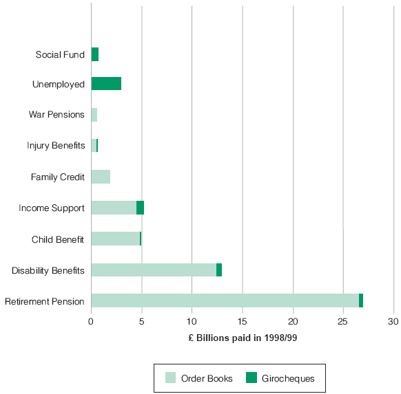 1.5 Most of the Department's customers still receive their benefit by order books or girocheques which they cash weekly at post offices. The process is expensive to administer and prone to fraud. In 1997-98, the Department paid over £400 million to Post Office Counters Ltd and Girobank for services related to cashing benefits. In addition, they spent a further £125 million themselves administering their existing payment arrangements. Because currently the encashed order books are not all reconciled to claimants' details the Department are unable to verify that all have been cashed, as required by basic financial accounting standards, though they can identify individual encashments.