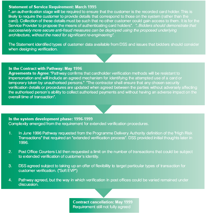 3.9 In accordance with Private Finance practice, the Department's part of the requirement was specified mainly in terms of the performance they required, rather than how the service was to be delivered technically. Pathway, like the other bidders, responded with their own technical solutions. Tokens and extended verification processes were elements of Pathway's proposed solution. At the time the contract was signed there was not a detailed design that demonstrated how the solutions in each of these areas would work in practice. Pathway's position is that their solution was robust enough at that time to be developed to meet the full requirement. This was also the view of the Department.