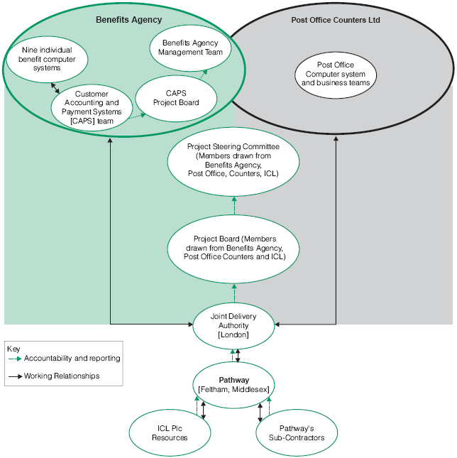 This was the organisation between the signature of the deal in May 1996 and the transfer of responsibility for dealing with Pathway from the joint Delivery Authority to Post Office Counters Ltd in April 1998. There was no overall programme management body overseeing progress in the Agency, Pathway and Post Office Counters. | |