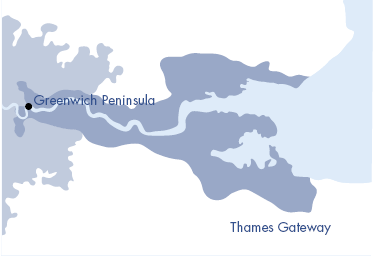 The Greenwich Peninsula is located in East London and is in a major regeneration area, the Thames Gateway.