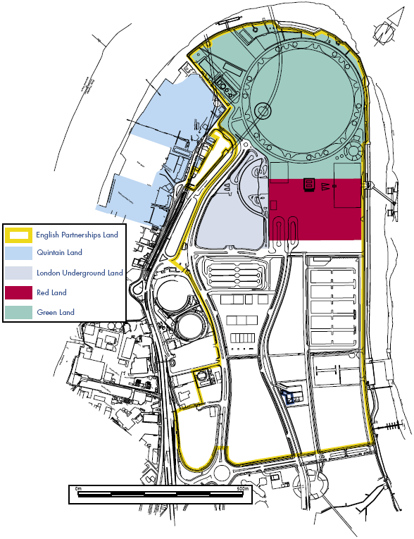English Partnerships own most of the land on the Peninsula, important areas are owned by London Underground Limited and by private companies.