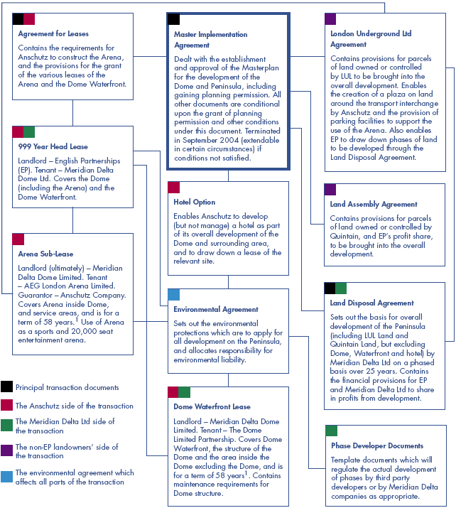 3.15 Anschutz is obligated to develop the Arena under the terms of the various contracts which are backed by an Anschutz Corporation Guarantee. Works have to start by 17 June 2005 and be completed in two years. In the event that Anschutz fails to start it would forfeit its Lease of the Arena site in the Dome and Meridian Delta would have the right to step in to assume the obligations of Anschutz. If Anschutz start but do not complete the Arena, Meridian Delta Limited and English Partnerships have step in rights and, if these rights are not exercised there are rights of termination of the Lease of the Arena and all of Anschutz's other rights in the Peninsula. The contract requires Anschutz Entertainment Group to provide a performance bond or equivalent assurance guaranteeing completion of the Arena, which can be called on if the work is not completed. This assurance is to be in place prior to the work starting, which in turn is required within twelve months of the Unconditional Date i.e. by 17th June 2005. At the time of writing the terms of the assurance are still being negotiated. When agreed it will afford additional protection to the guarantee from the Anschutz Corporation which already exists, and to the contractual and commercial pressures that will be on Anschutz because of other terms in the Legal Agreement.
