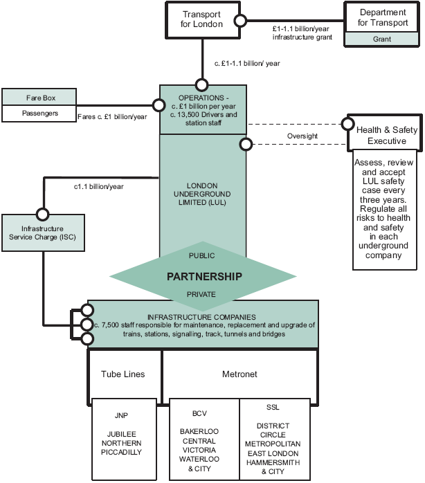 In July 2003, ownership of London Underground was transferred from central government to Transport for London (TfL), which reports to the Mayor of London. As provider of grant of some £1 billion a year the Department nevertheless retains an interest in the effectiveness of the PPP. Figure 1 shows the responsibilities of the key parties to the PPPs, and the funding flows between them.