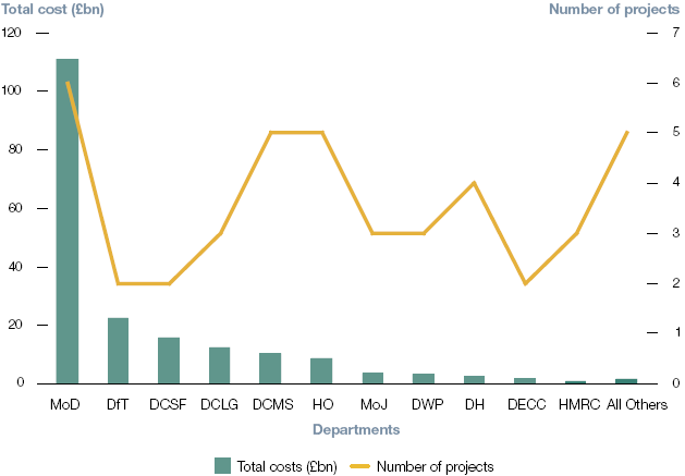 MoD = Ministry of Defence DfT = Department for Transport DCSF = Department for Children, Schools and Families DCLG = Department for Communities and Local Government DCMS = Department for Culture, Media and Sports HO = Home Office MoJ = Ministry of Justice DWP = Department for Work and Pensions DH = Department of Health DECC = Department of Engergy and Climate Change HMRC = HM Revenue & Customs Source: HM Treasury Major Projects Portfolio as at September 2009 NOTE Based on departments' total estimated programme costs or, where cost total has not yet been formally approved, the departments' best estimate of the total programme cost. |