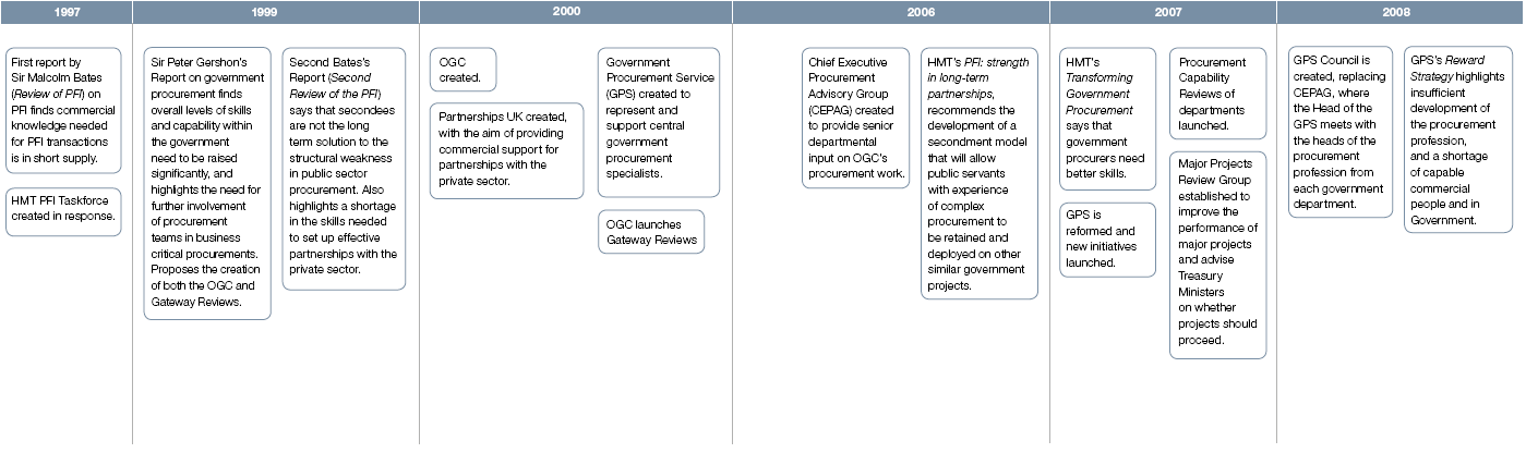 1.11 The importance of developing the commercial skills required to deliver complex projects has been recognised within government for over 10 years. In his 1999 report Review of civil procurement in Central Government,3 Sir Peter Gershon concluded that the level of commercial skills across the procurement profession needed to be raised significantly. The report triggered the creation of OGC in 2000, and soon after the creation of the GPS and new professional standards for commercial professionals. In 2007, HM Treasury's publication of Transforming Government Procurement4 outlined a significant programme of initiatives to both assess and improve the commercial skills in government (See Part Three). A high level timeline of public sector commercial skills development is set out in Figure 4 on pages 18 to 19.