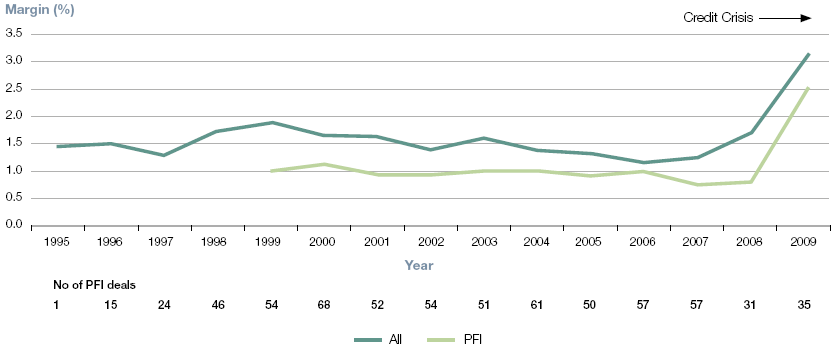 NOTES 1 The margins are averages based on monthly data. 2 Numbers in bold are the number of PFI projects financed in that year. Source: National Audit Office and project finance chart based on data from the Infrastructure Project Finance Benchmarking Report 1995-2009 further description at http://infrastructureeconomics.org/2010/02/09/project-finance-benchmarking-report/ |