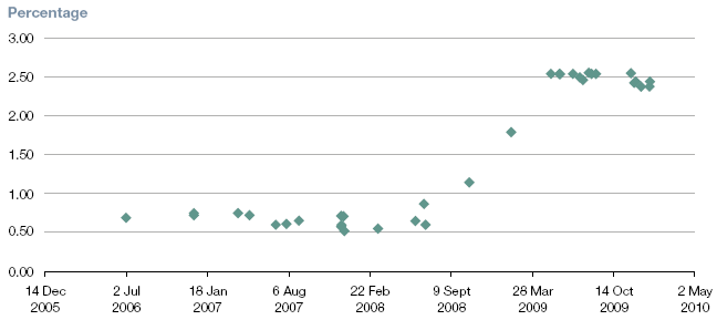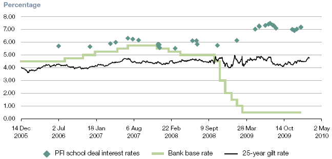 2.5 The increased cost of finance has generally been passed through by the private sector service provider to the public authority in the form of an increased monthly payment, known as the unitary charge. In Appendix Two, Figure 15 sets out the impact in real terms, compared to projects that were financed in 2007, and suggests that, on an all-in basis, the extra cost increased by around 5.6 per cent to 7.4 per cent. The financing costs of schools projects, which are fairly typical, moved up sharply at the start of 2009 (Figure 10).