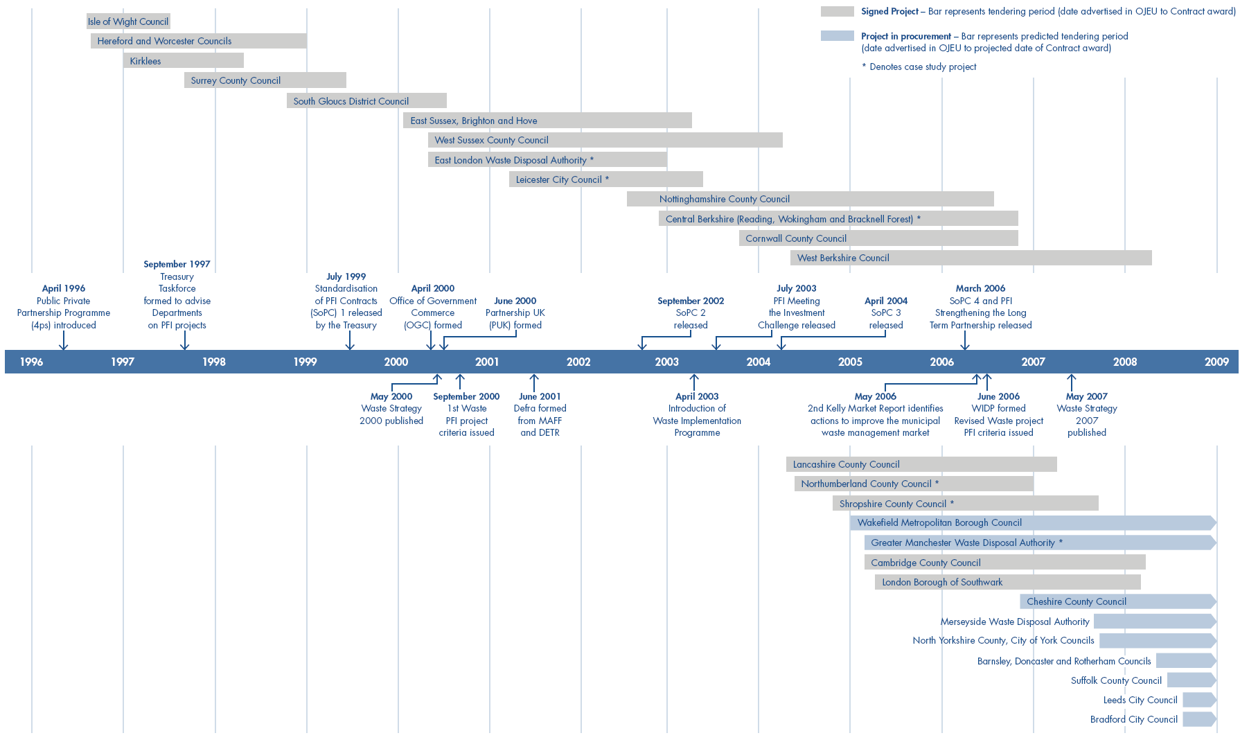 2.8 Local authorities are developing projects in greater numbers than in previous years: at summer 2008, nine projects were in procurement and a further 19 had submitted a business case, or expressed an interest in using PFI. Projects yet to start procurement will not contribute significantly to landfill diversion in time for 2013, though they will make a substantial difference to the 2020 target.
