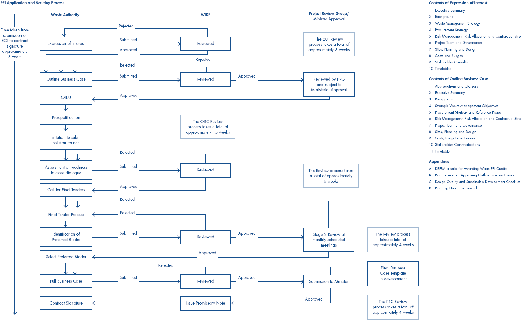 Projects first submit an Expression of Interest (EOI) to the Department. This is evaluated against the PFI Credit Criteria. Following this, authorities must submit an Outline Business Case (OBC). First the Department reviews the OBC and if satisfied seeks ministerial approval for the project. Once that approval is received, the project then moves on to the Project Review Group (PRG) stage.