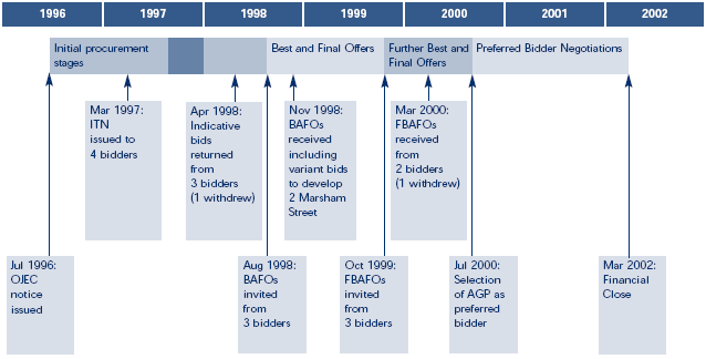 1.2 Annes Gate Property plc (AGP) was selected as the preferred bidder in July 2000 and the deal was finalised in March 2002. The project involves the demolition, the design and construction of new buildings on the site, the relocation of up to 3,450 Home Office staff and the provision of support services for 26 years. The new building will occupy around two-thirds of the site with the remainder being a separate development of mixed residential and commercial premises to comply with Westminster City Council planning requirements for the area.
