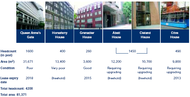 | NOTE Since March 2002 both the staff numbers and the estate have changed. Clive House has been acquired by the Department for Constitutional Affairs and is currently being refurbished. The Home Office has acquired Allington Towers from the Treasury (accommodating 375 staff) and Ashley House from the Office of Government Commerce (accommodating 130 Home Office staff). See Figure 4 for total current staff numbers. | |