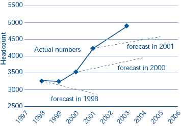 | This graph shows that actual staff numbers have increased rapidly since 1999. The project team forecast in 1998 was for a drop in numbers |