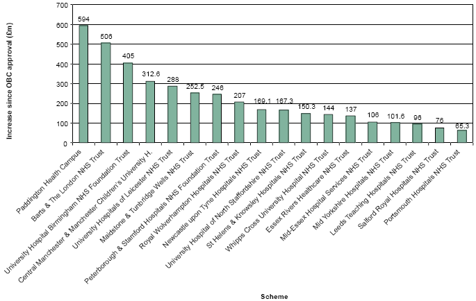 12. By the end of 2005 the Department had approved in principle the development of capital investment schemes with an estimated capital value of £13 billion. Local NHS Trusts would contract with private sector suppliers, who would build hospitals. The value of the capital programme represented a substantial increase over the original approved schemes. For the 17 schemes over £75 million that the Department reported on in November 2005 and the cancelled Paddington scheme, the estimated valuation in November 2005 was some £4 billion above the approved scheme valuations (Figure 3). Overall the schemes increased by an average of 117% over the original approved values.13