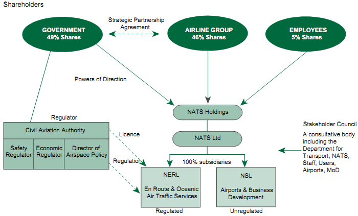 National Air Traffic Services (NATS) is the company which provides air traffic control for aircraft flying over the United Kingdom, and with its Irish counterpart, the North East Atlantic. In July 2001 the Transport Department concluded a Public Private Partnership (PPP) with the Airline Group, a consortium of seven UK-based airlines, giving the Group operational control and a 46% share of NATS (Figure 1). Proceeds were nearly £800 million, of which £65 million came from the Airline Group and the rest from bank loans that are repayable by NATS itself. As a privatised body, NATS' prices are subject to economic regulation by the Civil Aviation Authority. The structure of the PPP has affected its ability to develop its business and finance its £1 billion investment programme over the next ten years. Events following September 11th 2001 have highlighted these risks.1