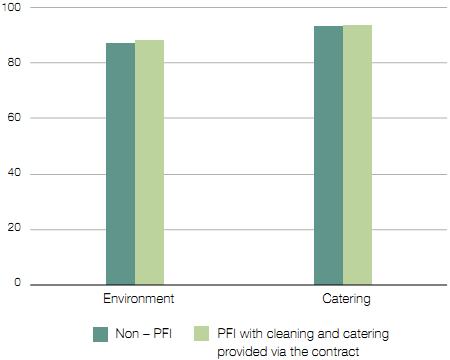 c There is no difference between PFI hospitals and the rest of the NHS in assessments of environment and catering. Patient Environment Action Team scores show that PFI hospitals are not performing significantly better or worse than other hospitals (Figures 6 and 7 on page 19).