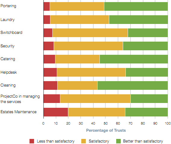 2.3 Twenty-four Trusts (33 per cent) rated at least one service as below satisfactory (Figure 9 on page 22) and no Trust rated all services as excellent. Maintenance services and the ProjectCo's performance in managing the contract were the areas most frequently cited as underperforming. But the issues that Trusts raised varied (Figure 10 overleaf) and our analysis did not identify a clear set of causes for dissatisfaction. The age of the contract, the subcontractors providing services, or the level of resource invested in contract management are not correlated with the level of satisfaction.