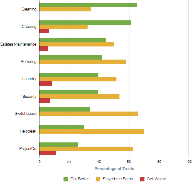 d The majority of Trusts report consistent or improved performance over the course of the contract. The majority of Trusts said service delivery had either stayed the same or improved. For cleaning and catering services the majority of Trusts have seen an improvement (Figure 8 on page 20).