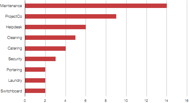Figure 10 • King's College Hospital was dissatisfied with lift maintenance. Broken lifts meant patients often share lifts with visitors to get to operating theatre. This is an ongoing issue yet to be resolved. • Oxford Radcliffe Hospitals was dissatisfied with cleaning standards and developed a collaborative working agreement with its contractor to improve performance for the benefit of the Trust and its patients. • Dudley Group of Hospitals believes the portering function is understaffed and patients are not always moved within the required time, delaying treatment. The Trust worked in partnership with the contractor to improve efficiency by introducing Lean principles. • Hull and East Yorkshire experienced poor performance on some maintenance work. A high level of involvement from matrons has since ensured that clinical and maintenance services run smoothly together. • St Helens and Knowsley Hospitals' contractors initially provided inappropriate patient menus and communicated poorly with those on elderly wards. The Trust worked with contractors to resolve issues quickly and now rates its catering highly. • Buckinghamshire Hospitals NHS Trust believes that change requests often take too long to process and lead to an increase in payments. This can inhibit change, so reducing operational flexibility. It performed a lessons learnt exercise to improve the efficiency of future changes. • University College London Hospitals stated that the contractor's inconsistent helpdesk service made Trust staff reluctant to use it, which meant problems were unreported. Both parties worked together to develop a plan to feedback regularly on the progress of jobs to build confidence in the contractor's helpdesk processes. Source: National Audit Office case studies |