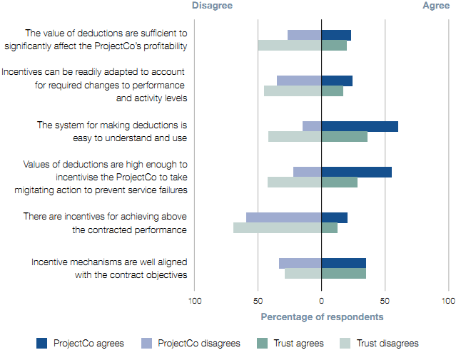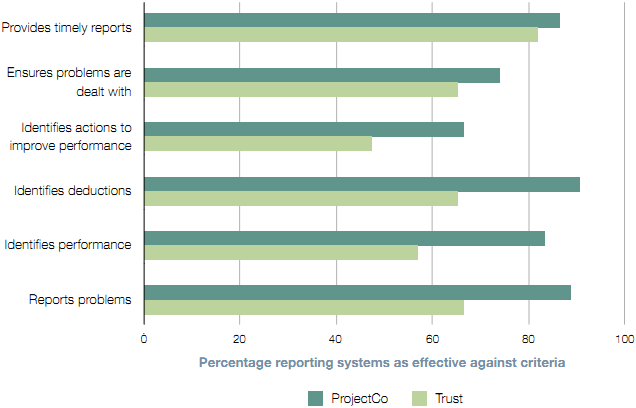 b Individual performance indicators could be improved, but together provide each Trust with an overview of performance. Most Trusts are positive about most targets, although 45 per cent stated that their systems contained performance indicators that did not meet all of our good practice criteria (Figure 15 overleaf). Seventy-seven per cent of Trusts say their Performance Management System is effective at reporting performance (Figure 14). c Most Trusts verify the accuracy of performance reports. Contracts are designed to be 'self-reporting': the contractors provide the performance information in the Performance Management Systems. But Trusts have a responsibility to verify the information, by sample checking the data, to ensure they are getting the level of service required. Two of our eight case studies, however, carry out no auditing of the data. We also believe some Trusts do not have enough contract management staff to monitor performance (paragraph 3.6). d The Performance Management Systems do not always provide sufficient incentives to improve performance. Deductions are not intended to reimburse Trusts for the full effects of poor performance. But deductions are sometimes too small to drive performance. For example: • East Lancashire Hospitals levied a deduction of 47 pence for a failure to fix a tap within the set timeframe. • At Hereford County Hospital, the contractors told us they decided it was cheaper to receive a deduction than provide an alternative cooling system to keep an operating theatre open whilst they repaired the main system. • Some systems only penalise initial failures. Oxford Radcliffe's contract allows only one deduction for specific portering failures in an eight-hour period. Thus there is no incentive to meet targets following an initial failure. Many Trusts and ProjectCos are sceptical that their systems and deductions provide sufficient incentives to contractors (Figure 16). |