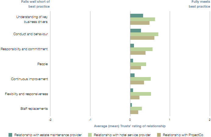 We asked Trusts to rate their relationships against seven key aspects of a good relationship. These were: Understanding of key business drivers: We have a mutual understanding of all relevant issues about the contract and services being delivered and each other's business needs and goals. Conduct and behaviour: We talk to each other openly and honestly, at all times, on all issues; we have implicit faith in each other's professionalism and integrity. Responsibilities and commitments: We trust each other to meet our respective responsibilities and deliver what has been agreed. People: There is mutual trust, confidence and respect at all levels; we are confident in the people we work with; and we are consulted about staff performance. Continuous improvement: All parties view the relationship as one team, although we recognise our different responsibilities within the team. We continuously seek to improve our team performance and relationship. Flexibility and responsiveness: All parties always respond quickly and supportively. Staff replacements: We are consulted about staff replacements, and staff turnover has little impact on our relationship. NOTE 1 -2 equals the relationship falls well short of the best practice statement and 2 equals relationship fully matches up to the best practice statement. Source: National Audit Office Survey of Trusts |