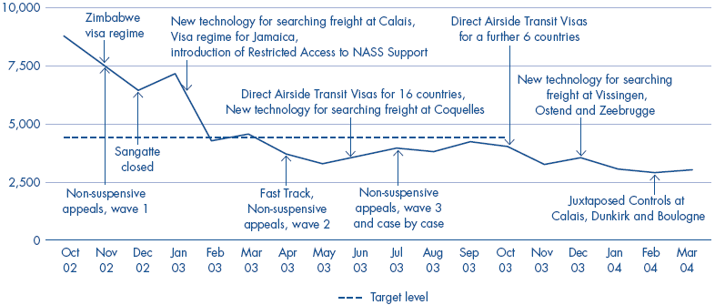 15 Meanwhile the number of applications to the UK for asylum halved between October 2002 and September 2003, due to a range of statutory and non-statutory measures to reduce the number of applications, and to wider trends in asylum flows (see Figure 2).