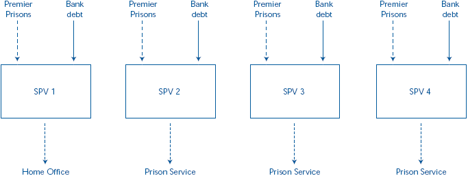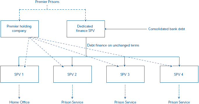 | Before the restructuring Premier Prisons had four PFI contracts, three with the Prison Service and one with the Home Office. Each project was owned by Premier Prisons through a project company known as a special purpose vehicle (SPV) and separately financed by bank debt.