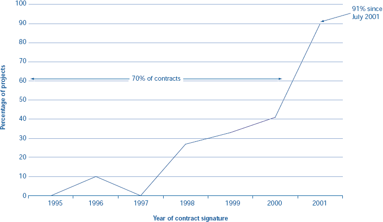| This figure shows that 70 per cent of PFI contracts were let prior to June 2000 when most PFI contracts did not have clear refinancing gain sharing mechanisms. The proportion with such mechanisms has increased substantially in recent years and rose to 91 per cent for contracts signed since July 2001.