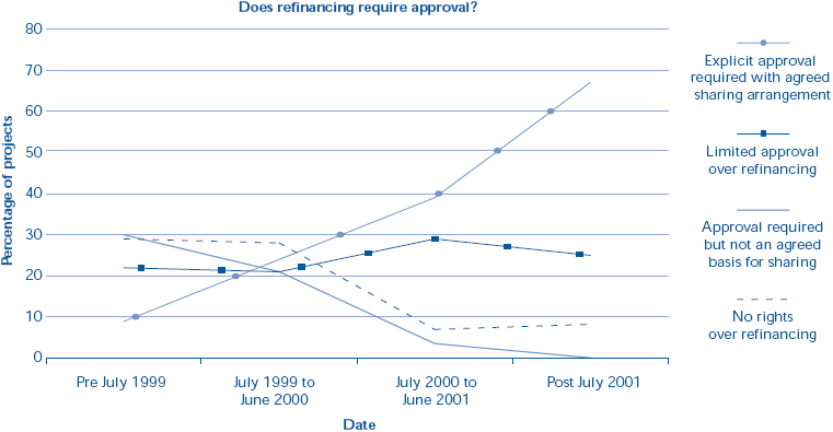 | This figure shows that the level of deals where explicit approval is required for a refinancing and there is a refinancing gain-sharing mechanism (black line) has risen from 9 per cent of deals signed before July 1999 to 69 per cent of deals signed after July 2001. This has increasingly replaced other lesser forms of approval arrangements (other lines).