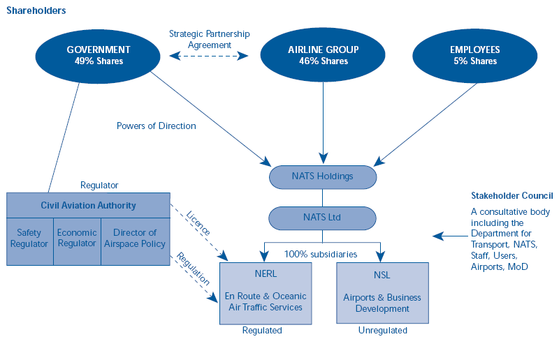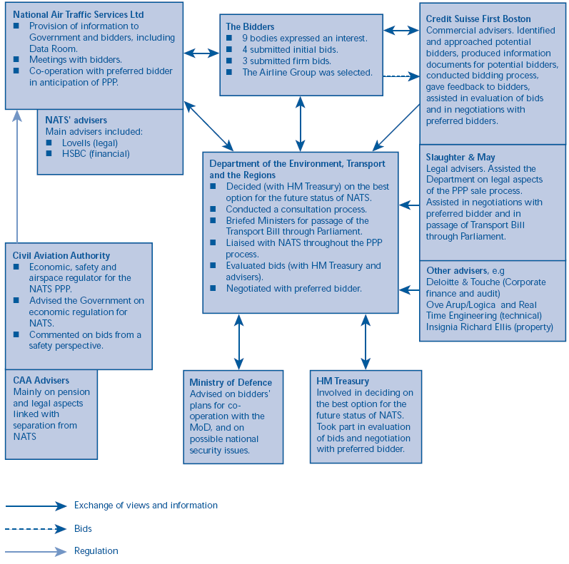 | For maintaining and enhancing standards of safety and security ■ To enhance aviation safety in the UK by separating regulation from service provision; ■ To maintain NATS' effective contribution to national security through effective civil/military joint working arrangements; ■ To maintain effective accountability to Government as shareholder, to the CAA as regulator and to the wider public interest. For developing NATS' business ■ To ensure that NATS has access to the necessary project and complementary commercial management expertise to provide for its long-term development as a safe and efficient air traffic service provider; ■ To ensure the strategic partner takes responsibility for managing NATS' strategy, investment programme and new business development; ■ To provide NATS with the commercial freedom to develop its business, within the necessary framework of incentives, regulations and other disciplines; ■ To introduce new incentive and performance based regulation to replace the existing "cost-plus" charging regime, to encourage timely and appropriate investment and ensure value for money for NATS' customers; To provide value for money for the taxpayer ■ To ensure NATS has access to adequate capital without adding to pressure on public sector borrowing; ■ To ensure long-term value for money for the taxpayer and generate sales proceeds to help fund other transport programmes.1 NOTE 1. The Department for Transport had expected sale receipts of £500 million and this was included in their Public Expenditure provision. Without these receipts transport spending may have reduced. Source: Department of Transport, Local Government and the Regions |