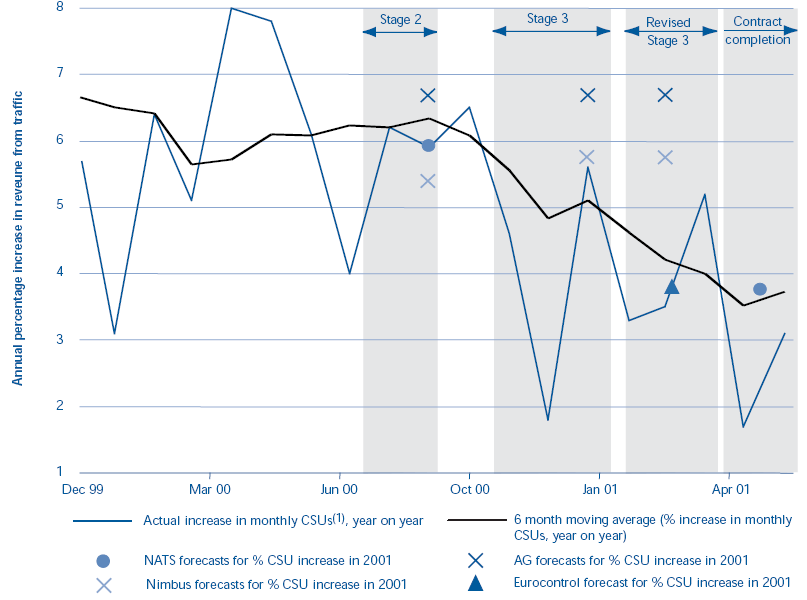 1.20 The value of NATS is heavily dependent on forecasts of the number and size of aircraft using its services since this affects its en route revenues. The bidders drew on NATS' own traffic forecasts, but came to their own views. The Airline Group's forecast of future traffic growth had consistently been the highest of the bidders. Figure 10 overleaf shows that its forecast for 2001 remained unchanged at 6.7 per cent, despite indications by the end of 2000 that traffic growth might be reducing. This decline was due primarily to the slowing US economy and secondly, from February 2001, the effects on the tourist market of foot and mouth disease. In March 2001, the European air traffic management authority, Eurocontrol, revised its 2001 forecast for the UK down from 5.9% to 3.8% growth. The information from Eurocontrol was supplied to the Department, who were also receiving weekly traffic reports from NATS. The Department continued to use NATS' September 2000 traffic forecast as the benchmark in the selection of the strategic partner. Increasing evidence that the US economic slowdown was having a persistent effect on UK traffic levels caused NATS, in conjunction with the Airline Group, to revise its forecasts in May 2001. In terms of whether an earlier revision should have been made, NATS considered that the bidders were also getting monthly reports of traffic levels and should have been able to draw their own conclusions as to whether a downturn was occurring.