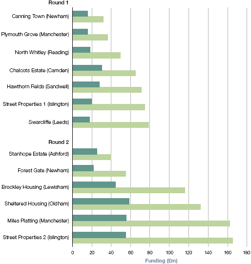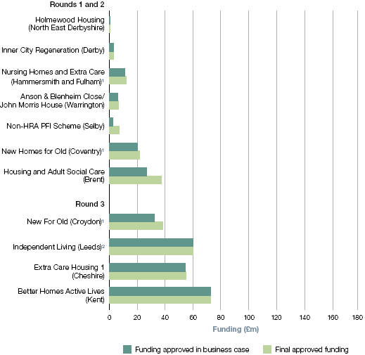 NOTE 1 These projects received part of their funding from other departments; for details see project details at www.nao.org.uk/pfi-housing-2010. 2 Independent Living received an additional £4.5 million from the Department for Education after the contract was awarded to build an additional asset. Source: National Audit Office analysis of data from the Department for Communities and Local Government |
