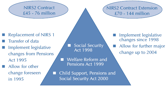 1 NIRS 2 - the National Insurance Recording System - is a large and complex computer system designed to support the Inland Revenue's administration of the national insurance scheme. It was developed under the Private Finance Initiative to replace the previous National Insurance Recording System (NIRS 1). The Contributions Agency, then part of the Department of Social Security, was responsible for the development project. Following a competition, the Agency awarded the NIRS 2 contract to Accenture - then Andersen Consulting - in 1995. The contract covered the replacement of NIRS 1, transfer of data to the new system, development of the system to implement legislative changes arising from the Pensions Act 1995, and the operation of the new system until 2004.