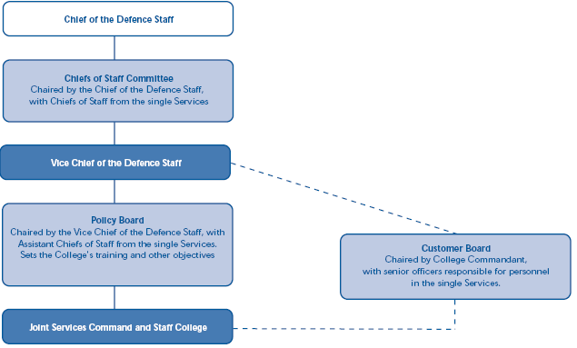 1.31 In addition to its formal evaluation of training, the College gathers feedback from its formal governance structure (Figure 6). The College considers that this structure, combined with the evaluation feedback, ensures that all its key customers within the Department have the opportunity to comment on the appropriateness and quality of the training. The College is concerned, however, that the Customer Board currently does not include all the College's stakeholders. It therefore informally seeks feedback on its training from all stakeholders who visit the College to deliver lectures to the students. The College also recognises that the formation of the Defence Academy will provide it with an opportunity to address its concerns over stakeholder representation on its governance structure.