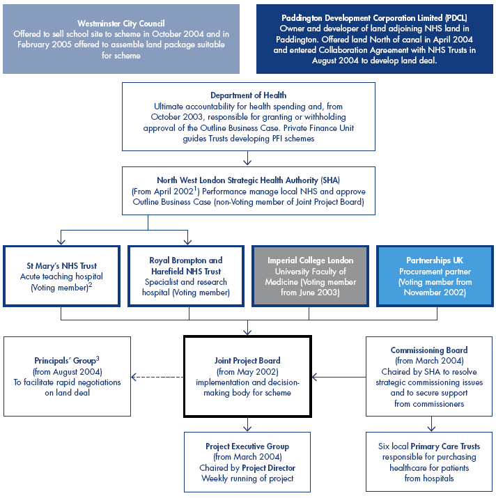 1 The project was initially sponsored by the West London Partnership Forum. The Forum oversaw the scheme through its Paddington Basin Project Board from April 2000 to March 2002. 2 The other non-voting members of the Joint Project Board were the North West London Strategic Health Authority and the Kensington and Chelsea, Westminster and Brent Primary Care Trusts. 3 The Principals' Group comprised the Chairs, Chief Executives, Finance Directors and nominated Non-Executive Directors of the two NHS Trusts, the Project Director, the Paddington Health Campus land negotiator, the Chief Executive and Chair of the North West London Strategic Health Authority, and representatives from Imperial College London, the Department of Health (until January 2005) and Partnerships UK. It was chaired by the Strategic Health Authority. It was not a formal part of the Campus accountability framework but met every week. | |