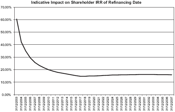 The IRR is a product of the timing of the refinancing and as a result of the refinancing being completed in December 2003 the IRR for the shareholders is 60%. The graph attached shows that the IRR changes dramatically dependent on the timing of the refinancing.