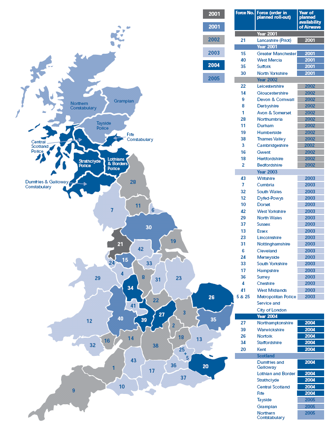 3.4 There are 52 police forces involved in Airwave (8 in Scotland, 43 in England and Wales plus the British Transport Police). The English and Welsh forces are split into four cohorts rolling out over a four-year period as shown in Figure 15. Scotland will join in 2005. Priority has been given to those forces which have the greatest need for Airwave, while forces that have purchased newer radio systems are in the later cohorts.
