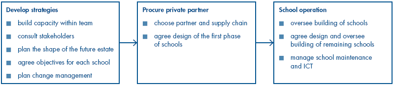 Schools | Provide funding towards ICT and maintenance budgets and helps the Local Authority procure the LEP. Plan the use of new buildings and work with the private sector partner and its supply chain to manage rebuilding work. | |