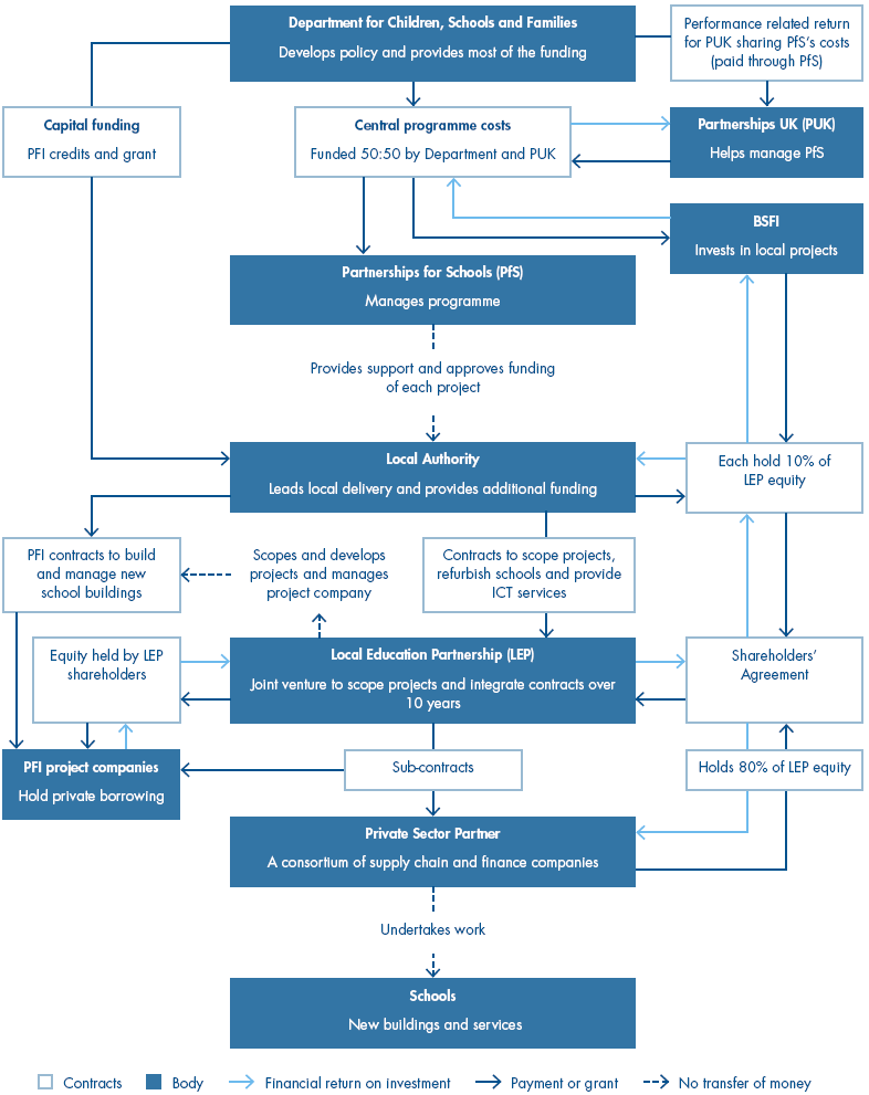 Building Schools for the Future Investments (BSFI) | A limited liability partnership between the Department and PUK to provide influence in the management of LEPs. BSFI invests as a minority shareholder in LEPs alongside each Local Authority and their private sector partner, and appoints a Director to each LEP's Board. | |