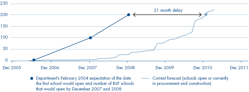 2.5 The programme started more slowly than the Department expected. In 2004, the Department announced that 200 new BSF schools would be open by December 2008.2 The current forecast is for the 200th school to open in September 2010, a delay of 21 months. The main reasons are that the Department underestimated: