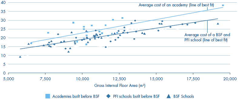 2.20 Figure 13 shows the spread of the price of BSF schools compared to PFI schools and Academies built to date and that Academies are generally more expensive than the BSF or PFI schools.
