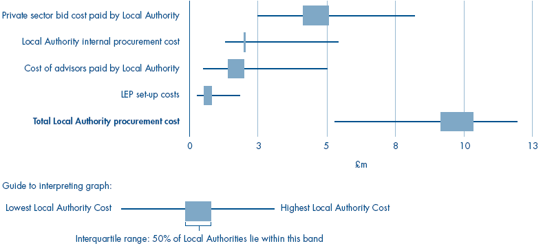 3.23 Once established, a LEP can lead to cost savings in each of the projects it develops, but the costs of establishing the first LEPs and designing their first projects have been higher than they need to be (Figure 17). Accurate data is scarce as Local Authorities record costs differently or not at all. But we estimate that for the first fifteen LEPs the combined total cost of the Local Authority's and the winning bidder's staff time, consultants and legal costs averaged between £9 and £10 million. This total combined cost covers the costs of designing the first few schools, procuring a private sector partner (the Local Authority's staff and consultants costs) and legal costs associated with setting up the LEP. Figure 17 shows the interquartile range of estimates for individual projects provided by Local Authorities and includes: