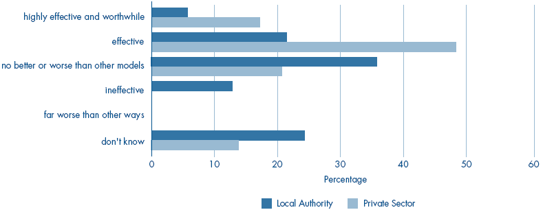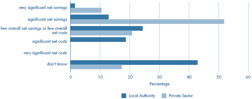 3.32 We found, through our case studies and census of all Local Authority BSF project managers, that most Local Authorities thought it was too early to tell if the expected benefits of the LEP (set out in paragraph 3.16) will be realised. Only 14 per cent of Local Authority BSF managers believe the LEP will produce savings, less than those who think it will add to costs (Figure 19 overleaf). Many did not know. Private sector partners are more favourable to the LEP. Nearly two thirds of the private sector partners questioned in our survey believe the LEP will produce savings.