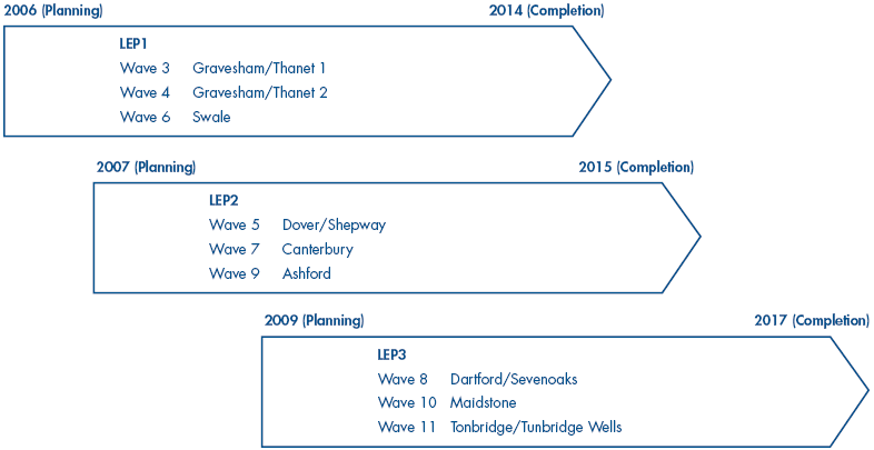 21 Kent's school estate is one of the largest in England. Its BSF programme has been scoped to be delivered by three LEPs, with a total estimated £1.8 billion expenditure budget. It may extend one of the first two LEPs instead of procuring a third.