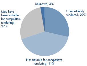 2.4 In 2006, 70 changes with a cost of £100,000 or higher were made in 43 PFI projects.4 Between them, these changes contributed to 90 per cent of the total spend on PFI changes in England. Appendix 2 sets out the details of each major change and Figure 7 shows that a competitive tendering process was carried out for about 29 per cent of changes, 41 per cent of changes were unsuited to a competitive process and that around 27 per cent of changes (or 47 per cent of the total value of changes in 2006, most of which was accounted for by major changes to three projects5) may have been suitable but were not competed for a range of reasons.