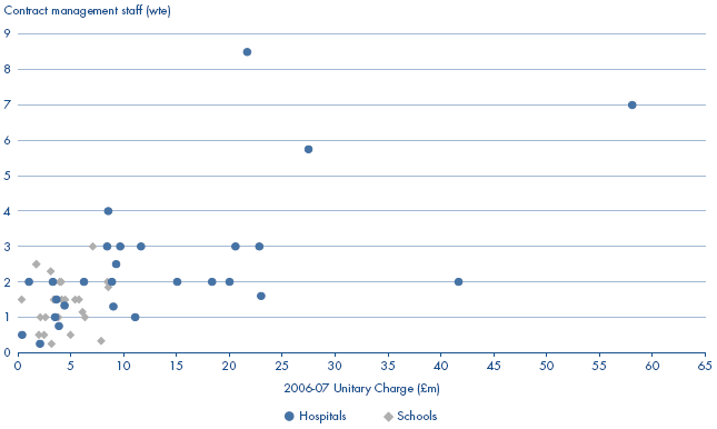 3.8 Although there is an overall correlation between the size of a project and the size of its contract management team, there are large variations in the level of resources devoted to the management of PFI contracts of a similar size.18 Figure 13 demonstrates this for the schools and hospitals sectors. Overall, a third of contract managers at PFI hospitals and one in six contract managers of PFI schools we surveyed described their teams as under-resourced. Over 15 per cent of PFI projects we surveyed were not being managed on a full-time basis, including ten with annual unitary payments of more than £3 million each.