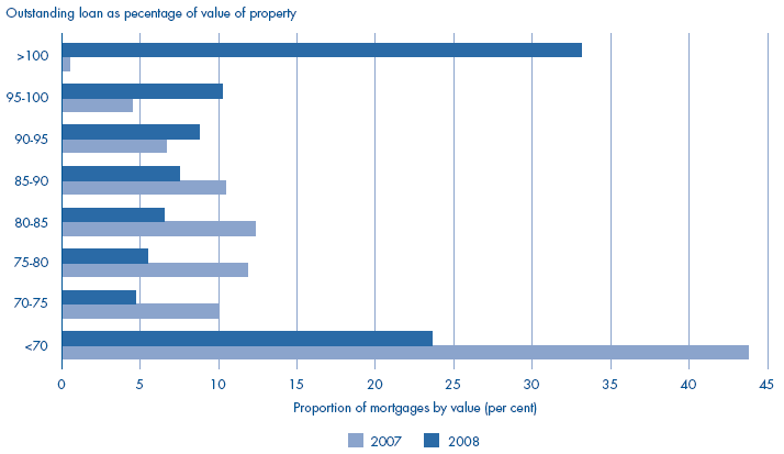 ■Impact of declining house prices. Declining house prices and higher arrears during 2008 meant that the risk weighting of mortgage assets, used to calculate the capital needed to meet regulatory requirements, was likely to increase. For instance, between December 2007 and December 2008, the proportion of the company's residential mortgage book where the amount lent exceeded the value of the property increased from 0.5 per cent to 33 per cent, excluding the unsecured element of Together mortgages (Figure 16);